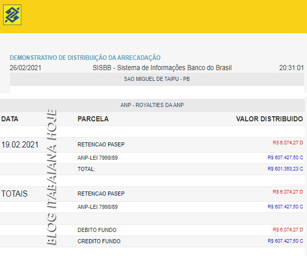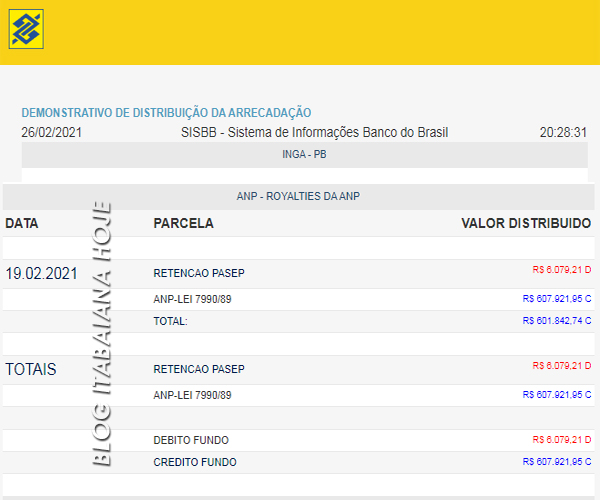 As prefeituras de Ingá, Caldas Brandão, Pedras de Fogo, Mamanguape, Alhandra, Bayeux e Santa Rita, receberam na última sexta-feira, 19, de FEVEREIRO de 2021, mais uma parcela do Royalties da ANP. Veja os valores creditados para as prefeituras beneficiadas pela passagem do gás natural em seus municípios. Valores pesquisados pelo blog Itabaiana hoje, junto ao Sistema de Informações do Banco do Brasil.
