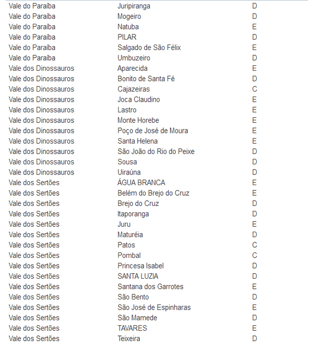 De acordo com o novo mapa, sete cidades estão nas categorias A, B e C, que são aquelas que concentram o fluxo de turistas domésticos e internacionais. Como exemplo, temos destinos como Cabedelo, Cajazeiras, Campina Grande, João Pessoa e Patos.