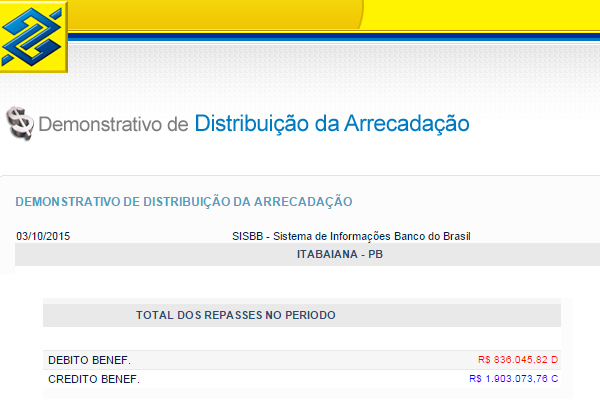 Recursos arrecadados à título de ISS (Imposto sob serviço) oriundos das obras do canal Acauã Araçagi, pela PREFEITURA DE ITABAIANA, foi de mais de um milhão de reais. Em 2014 a prefeitura recebeu 1 milhão 150 mil em ISS. De janeiro a julho deste ano, foram depositados mais de 400 mil reais em ISS. Quanto ao FPM, foram creditados R$ 1.903.073,76 em setembro de 2015. Acompanhe esses valores a seguir…