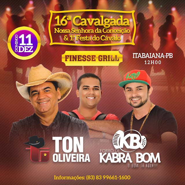 VEM AÍ!!! 16ª Cavalgada de Nossa Senhora da Conceição e 1ª Festa do Cavalo. Domingo, 11 de dezembro, a Cavalgada sairá às 09h00 do Parque de Vaquejada Nossa Senhora de Lourdes e encerrará no Finesse Grill com os shows de Ton Oliveira e Forró de Kabra Bom…. ATENÇÃO para os Preços: KIT Camisa da Cavalgada + Boné + Ingresso + Feijoada, R$ 50,00 — Ingresso Individual R$ 20,00… Mesas R$ 120,00… Vendas na Eletromix e Casa Max. Maiores Informações: (83) 9 9661.1600