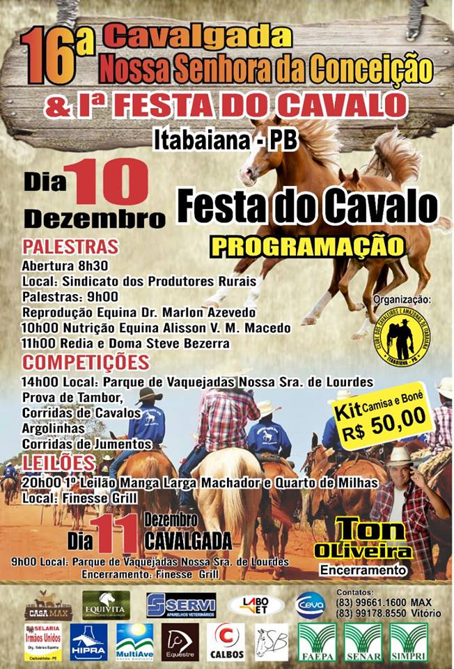 em ITABAIANA: Dia 10 de Dezembro / Festa do Cavalo / PROGRAMAÇÃO / PALESTRAS: Abertura 8h30 – Local: Sindicato dos Produtores Rurais / Palestra 9h00 / Reprodução Equina Dr. Marlon Azevedo / 10h00 Nutrição Equina Alisson V. M. Macedo / 11h00 Redia e Doma Steve Bezerra… COMPETIÇÕES: 14:h00 Local: Parque de Vaquejada Nossa Sra. de Loudes / Prova de Tambor, Corridas de Cavalo, Argolinhas, Corridas de Jumentos… LEILÕES: 20h00 / 1º Leilão Manga Larga Machador e Quarto de Milhas / Local: Finesse Grill… DIA 11 DE DEZEMBRO: 16ª Cavalgada Nossa Senhora da Conceição. 9h00 / Local: Parque de Vaquejada Nossa Senhora de Loudes / ENCERRAMENTO: Finesse Grill com TOM OLIVEIRA. KIT camisa e boné R$ 50,00