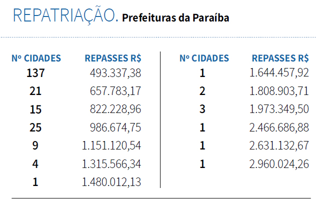 Itabaiana/ 1.151.120,54 — Juripiranga/ 657.783,17 — Salgado de São Félix/ 657.783,17 — Mogeiro/ 657.783,17 — Pilar/ 657.783,17 — São Miguel de Taipu/ 493.337,38 — São José dos Ramos/ 493.337,38 — Ingá/ 986.674,75 — Itatuba/ 657.783,17 — Gurinhém/ 822.228,96 — Pedras de Fogo/ 1.151.120,54…