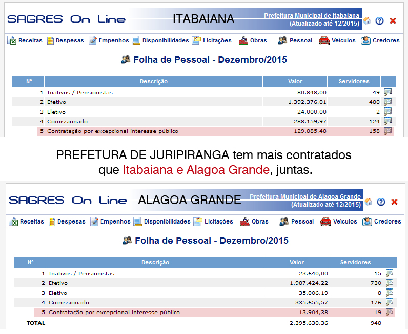 Prefeitura de Juripiranga aumenta o número de servidores contratados, três meses após o Pleno do Tribunal de Justiça da Paraíba, ter julgado ilegal as contratações na prefeitura e determinado concurso público. (2015: setembro 187 contratados, em dezembro 209 servidores contratados) … Prazo de 180 dias, determinado pelo TJ para a realização do concurso público termina este mês. Até o momento nem o edital do concurso foi publicado…
