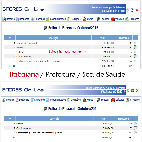 Último dado disponível pelo Sagres do TCE, pesquisado pelo blog Itabaiana hoje. FOLHA DE PESSOA das prefeituras da Região. Números e valores pagos a comissionados, contratados, efetivos e pensionistas. ITABAIANA / PREFEITURA: (124 comissionados R$ 148.324,21) … (157 contratados R$ 129.097,48) … ( 482 efetivos R$ 688.269,45) ( 49 pensionistas R$ 40.424,00) TOTAL: 814 servidores, valor da folha R$ 1.030.115,14… ITABAIANA / Sec. De Saúde: ( 52 comissionados R$ 79.834,00) … ( 221 contratados R$ 484.540,00) … (188 efetivos R$ 205.587,71) TOTAL: 451 servidores, valor da folha R$ 769. 961, 71.