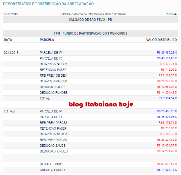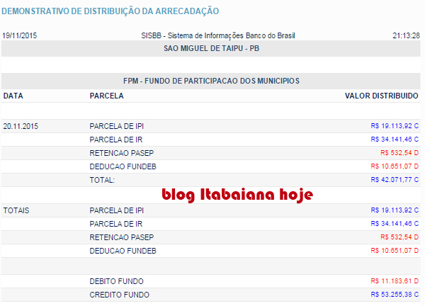 SAO MIGUEL DE TAIPU só fpm R$ 53.255,38 (fpm, icms e outros R$ 429.881,75) obs: A prefeitura de São Miguel de Taipu, recebeu R$ 284.635,82 em ANP – ROYALTIES DA ANP – LEI 9.478/97… FONTE: SISBB – Sistema de Informações Banco do Brasil