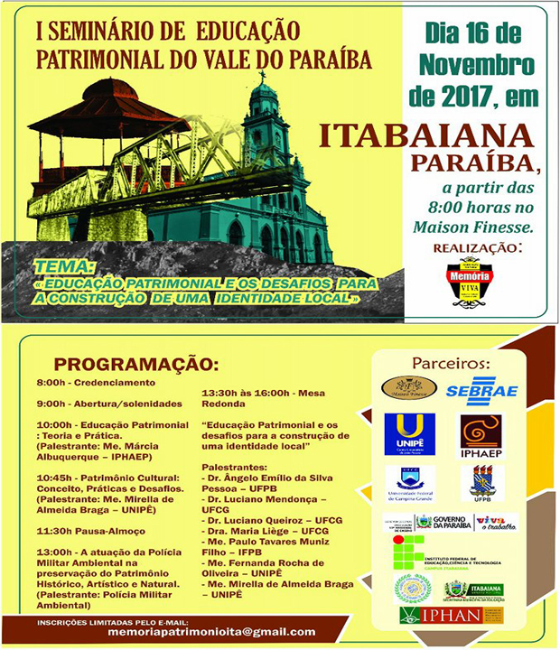 O município de Itabaiana à 80 km da capital paraibana, sedia nesta quinta-feira, dia 16 o I Seminário de Educação Patrimonial do Vale do Paraíba. A iniciativa é promovida pela Associação Cultural Memória Viva, instituição sem fins lucrativos existente há sete anos no município responsável pela promoção de ações de políticas públicas em favor do patrimônio cultural de Itabaiana.