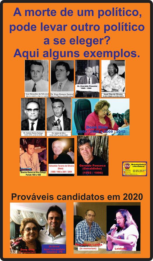 Será que nas eleições de 2020 esses fatos vão se repetir? Vão usar o nome e o legado de um ex-prefeito (a) para eleger os próximos prefeitos (a) das cidades de Itabaiana e Ingá? Pois na cidade do Ingá, teremos a candidatura de Leidinha que é sogra do filho do ex-prefeito Manoel da Lenha (in memoriam) e já havia sido lançada pelo mesmo para o cargo de prefeita, antes do seu falecimento agora em agosto.