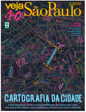 Veja São Paulo – O país em camadas. A revista aposta numa leitura urbana e simbólica do Brasil a partir da capital paulista. A cartografia colorida da cidade revela um país fragmentado, diverso e desigual, onde cada bairro carrega uma identidade própria e conflitos que se refletem no cenário nacional. A capa sugere um Brasil complexo, feito de sobreposições culturais, tensões sociais e disputas de espaço, em que compreender o todo exige olhar atentamente para os detalhes.