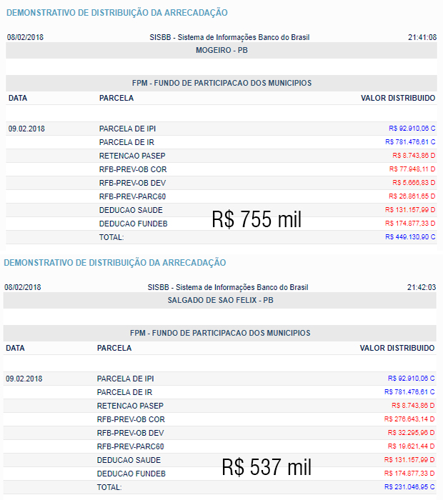 O 1º decêndio de fevereiro do Fundo de Participação dos Municípios (FPM) será creditados nesta sexta-feira (09). Veja os valores pesquisado pelo blog Itabaiana hoje, junto ao sistema de informações do Banco do Brasil… Atenção! Nos valores abaixo estão incluídos os recursos destinados para PREFEITURA / SAÚDE / FUNDEB…
