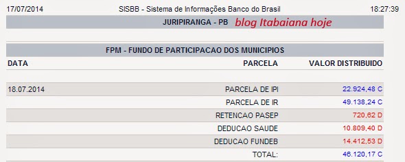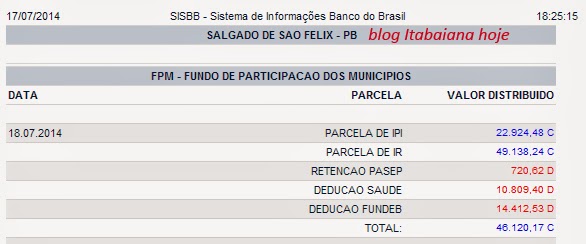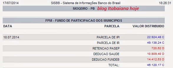 MUNICÍPIO DE ITABAIANA – Do dia 11 a 18 de julho, foram creditados R$ 221.172,33 e debitados R$ 56.107,59… Só em FPM serão depositados nesta sexta-feira,18, (Prefeitura R$ 80.710,28) + (FUNDEB R$ 25.221,94) + (SAÚDE R$ 18.916,45) … veja tabela completa de 7 prefeituras da região (só em FPM)…