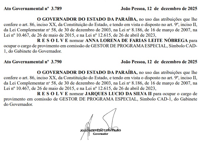 As nomeações constam nos Atos Governamentais de números 3.789 e 3.790, ambos datados de 12 de dezembro de 2025, e assinados pelo governador João Azevêdo. As medidas entram em vigor a partir da publicação oficial no Diário do Estado.
