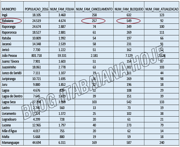 Na Paraíba 16.655 famílias tiveram o bolsa família cancelados e 56.943 foram bloqueados… Veja lista com o número de famílias que tiveram cancelamentos e bloqueios do Bolsa Família em ITABAIANA e Região… Em todos os 223 municípios paraibanos, milhares de famílias tiveram o benefício do Bolsa Família cancelados ou bloqueados.