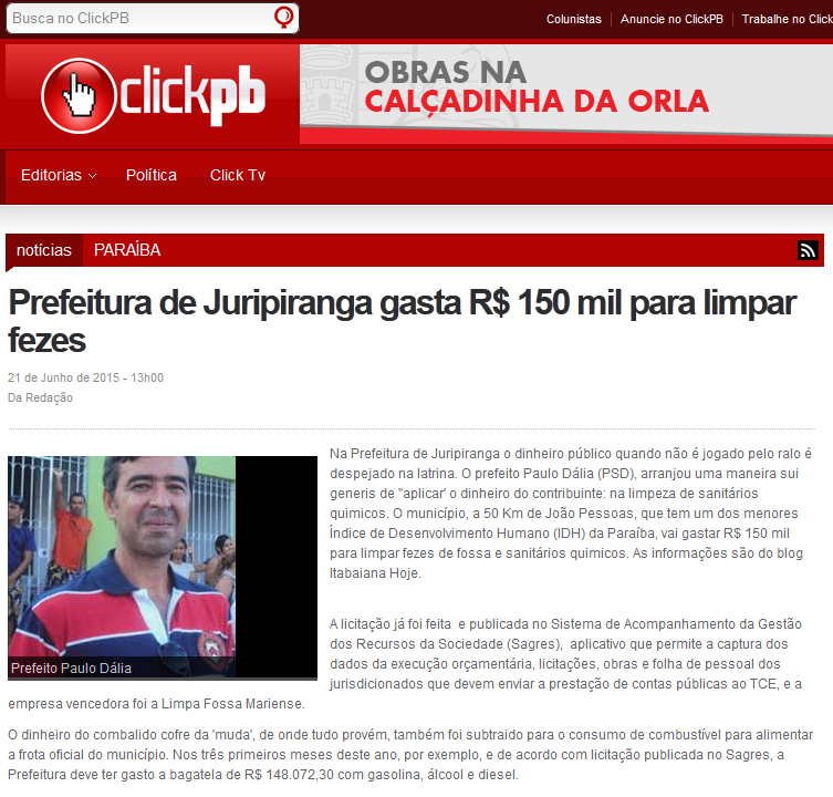 Gestão em JURIPIRANGA cheira MAL… é destaque no estado, através do Portal de Notícias CLICK PB…