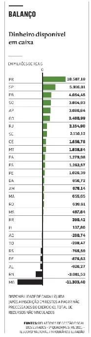 Como o Estadão mostrou, o Distrito Federal está nessa situação. Tirando os recursos carimbados para Saúde, Educação e outras vinculações obrigatórias, a disponibilidade ficou negativa em R$ 876,6 milhões (mais informações nesta página).