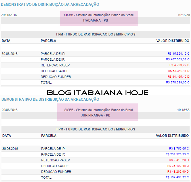 ATENÇÃO: veja na tabela abaixo, os valores correspondem ao FUNDEB, SAÚDE (TOTAL, é o valor creditado para a prefeitura) exemplo: Itabaiana, TOTAL/prefeitura 270 mil + Fundeb 84 mil + Saúde 63 mil = 418 mil reais.