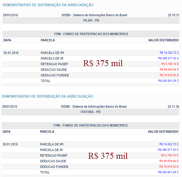 VEJA VALORES: O 3º decêndio de janeiro do Fundo de Participação dos Municípios (FPM) que serão creditados nesta terça-feira (30). Veja os valores pesquisado pelo blog Itabaiana hoje, junto ao sistema de informações do Banco do Brasil… Atenção! Nos valores abaixo estão incluídos os recursos destinados para PREFEITURA / SAÚDE / FUNDEB…