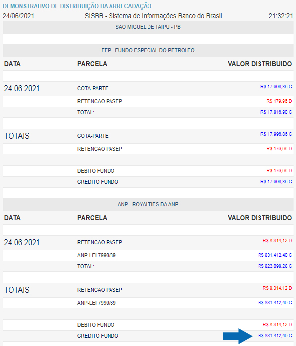 As prefeituras de São Miguel de Taipu, Ingá, Caldas Brandão, Pedras de Fogo, Mamanguape, Alhandra, Bayeux e Santa Rita, recebem nesta quinta-feira, 24 de JUNHO 2021, mais uma parcela do Royalties da ANP. Veja os valores creditados para as prefeituras beneficiadas pela passagem do gás natural em seus municípios. Valores pesquisados pelo blog Itabaiana hoje, junto ao Sistema de Informações do Banco do Brasil.