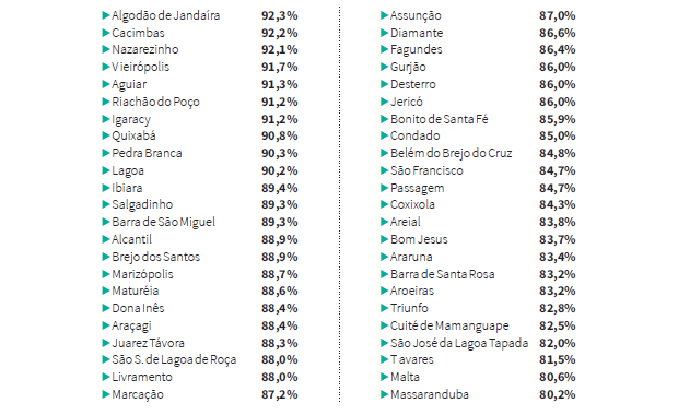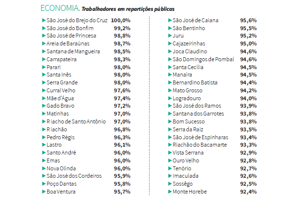 Pesquisa da Firjan. Mais de 41% das 223 cidades têm mais de 80% das pessoas ocupadas bancadas pelas prefeituras. … A Paraíba possui 92 municípios onde mais de 80% de sua população ocupada possui um emprego na gestão pública, ou seja, menos de 20% das pessoas trabalham em algum empreendimento no comércio ou outros segmentos. A grande maioria dos 530 municípios não tem arrecadação própria e depende das transferências estaduais e federais e conseguem arrecadar apenas 3,5% de sua receita líquida – porcentual quatro vezes menor que a média nacional, segundo a Federação das Indústrias do Estado do Rio (Firjan). A cidade de São José do Brejo do Cruz, com quase 1,8 mil habitantes possui 100% de sua população empregada ocupando cargos públicos, segundo um levantamento feito pela Firjan, responsável pelo cálculo do Índice Firjan de Gestão Fiscal (IFGF). O Brasil tem 530 municípios onde mais de 80% do mercado de trabalho é bancado pelas prefeituras, sendo 92 na Paraíba, o que representa uma fatia de 17,3% do montante nacional, um número bem signifi cativo, já que os outros 82,7% seriam divididos ainda entre outras 26 unidades da federação. Entre esses municípios, 96% estão em situação fiscal difícil ou crítica. De acordo com Jonathas Goulart, coordenador do estudo, os municípios que se encontram nesta situação (mais da metade dos que tiveram os dados analisados), apresentam um grande número de informalidade. “As pessoas que não estão empregadas na prefeitura, como no caso de São José do Brejo do Cruz, trabalha na informalidade, o que impede os municípios de se desenvolverem, já que não existe arrecadação de impostos e nem mesmo contratação de novos funcionários (já que, teoricamente, esse empreendimento não existe)”, conta.