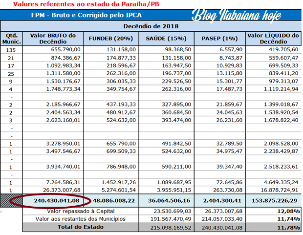 Na próxima sexta-feira, 9 de fevereiro, será creditado na conta das prefeituras o repasse do Fundo Municípios (FPM), referente ao 1º decêndio de fevereiro… O Valor BRUTO do Decêndio 240.430.041,08 será dividido com todos os 223 municípios da paraíba conforme o coeficiente…