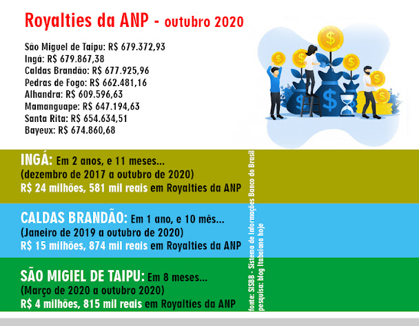 As prefeituras de São Miguel de Taipu, Ingá, Caldas Brandão, Pedras de Fogo, Mamanguape, Alhandra, Bayeux e Santa Rita, receberam nesta segunda-feira, 26 de OUTUBRO 2020, mais uma parcela do Royalties da ANP. Veja os valores creditados para as prefeituras beneficiadas pela passagem do gás natural em seus municípios. Valores pesquisados pelo blog Itabaiana hoje, junto ao Sistema de Informações do Banco do Brasil.