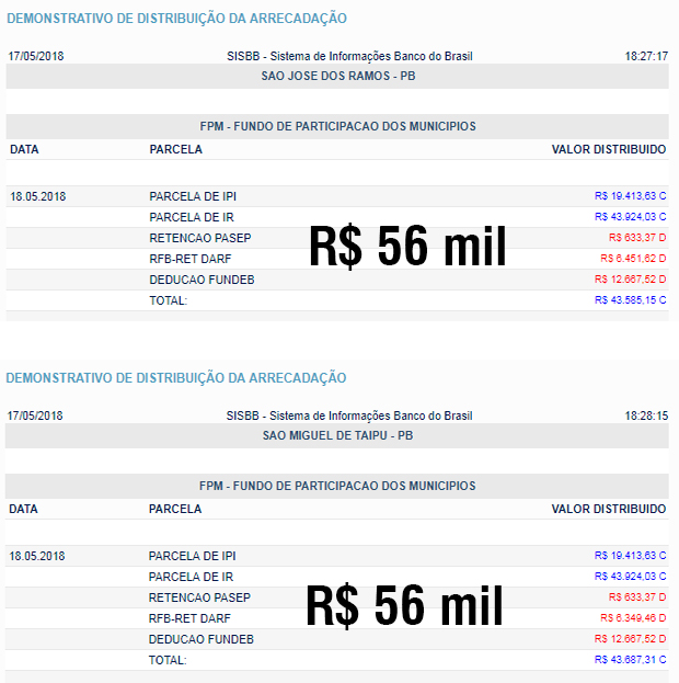 O segundo decêndio de maio do Fundo de Participação dos Municípios (FPM) será creditado nessa sexta-feira (18). Veja os valores pesquisado pelo blog Itabaiana hoje, junto ao sistema de informações do Banco do Brasil… Atenção! Nos valores abaixo estão incluídos os recursos destinados para PREFEITURA / SAÚDE / FUNDEB… (valor líquido creditado)