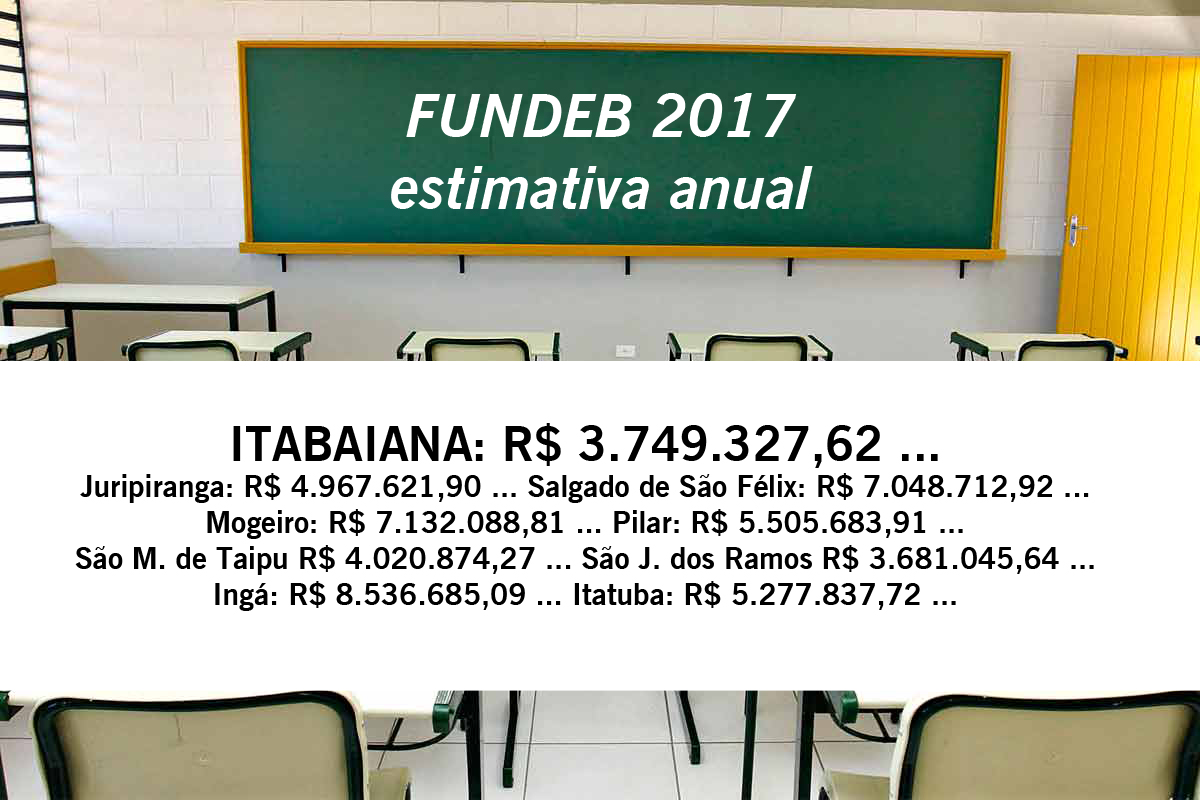 Estimativa do Fundeb para 2017 é publicada no Diário Oficial … Valor da Estimativa do Fundeb (2017) para ITABAIANA, é o menor da região. Com poucos alunos na rede municipal de ensino, o município de Itabaiana terá o menor repasse do fundeb entre os municípios vizinhos. Com a maior população da região, Itabaiana só supera São José dos Ramos em números de alunos matriculados na rede municipal. Fundeb 2017 / Estimativa anual…