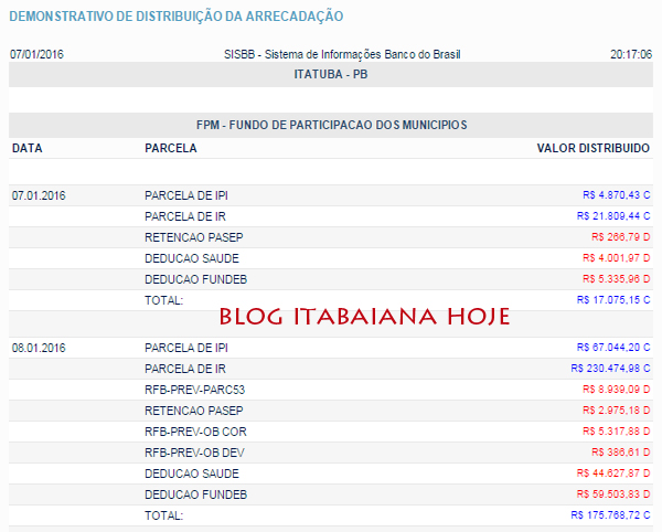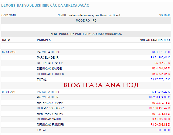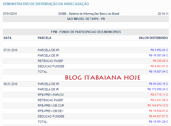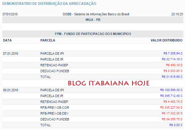 Prefeituras de MOGEIRO – SALGADO – PILAR e INGÁ, tem FPM zerados (valores foram creditados para saúde e educação). O primeiro repasse do FPM de janeiro de 2016, serão creditados nesta sexta-feira. Veja os valores: ITABAIANA: dia 7, prefeitura R$ 29.881,48, FUNDEB R$ 9.337,95, SAÚDE, R$ 7.003,45… DIA 8 prefeitura R$ 99.986,75, FUNDEB R$ 104.131,71, SAÚDE R$ 78.098,78… DESCONTOS DE PREVIDENCIA: RFB-PREV-OB COR R$ 148.440,73, RFB-PREV-OB DEV R$ 10.791,64 , RFB-PREV-PARC60 R$ 63.368,03… veja os valores de outras cidades da região… valores creditados nos dia 7 e 8 de janeiro…