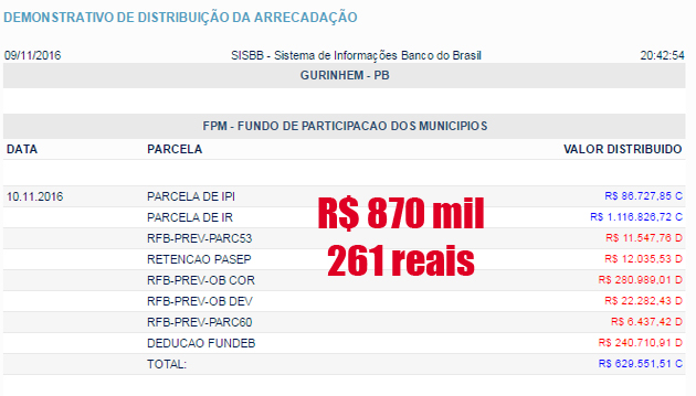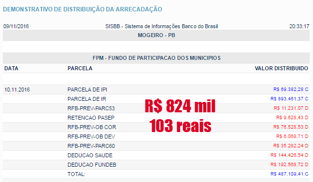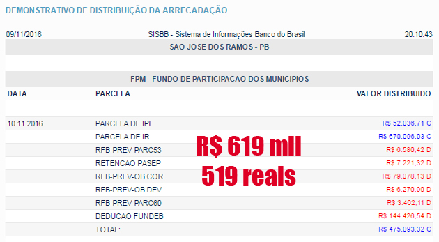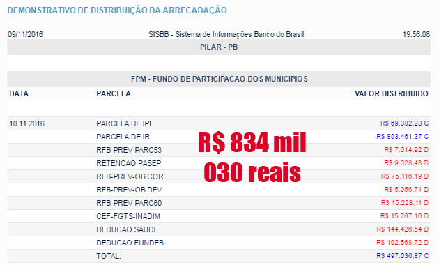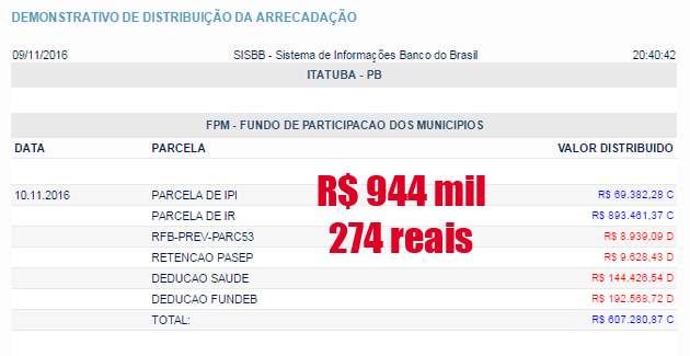 DE R$ 1.098.000,00 É BOM LEMBRAR QUE R$ 288.853,09 DO REPASSE QUE VEIO PARA A CIDADE DE INGÁ-PB; É PARA O FUMDEB OU SEJA PARA EDUCAÇÃO PARA PAGAMENTO DOS PROFESSORES E PESSOAL DE APOIO.