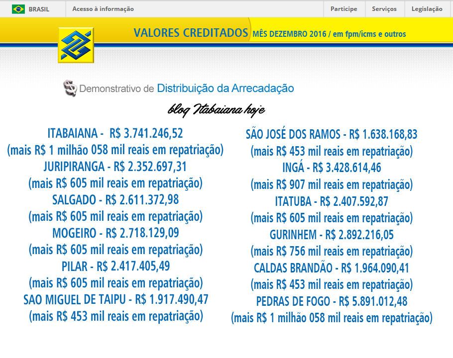 No mês de dezembro, foram quase R$ 5 milhões de reais creditados em contas para ITABAIANA em fpm, icms, repatriação e outros. … Veja o total creditados nas prefeituras da região, durante o mês de dezembro 2016. Em fpm, icms e outros. Incluindo repasses para a prefeitura, fundeb e saúde (não está incluído o fundo nacional de saúde que paga médicos e outros profissionais da aérea) … Veja a previsão de valores em repatriação, que chega nesta sexta-feira, 30.