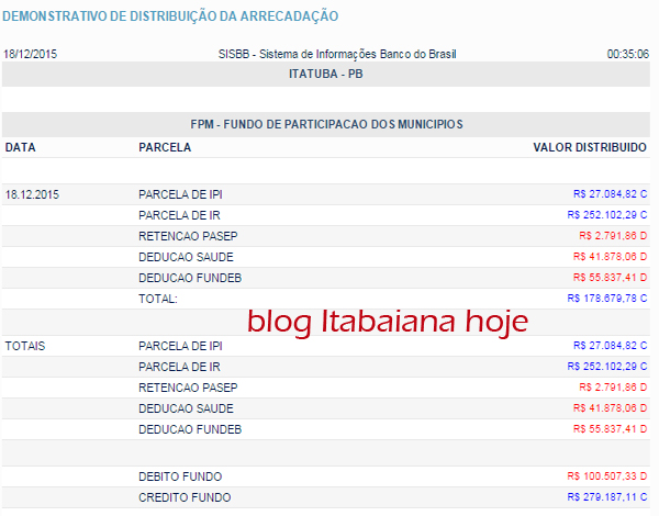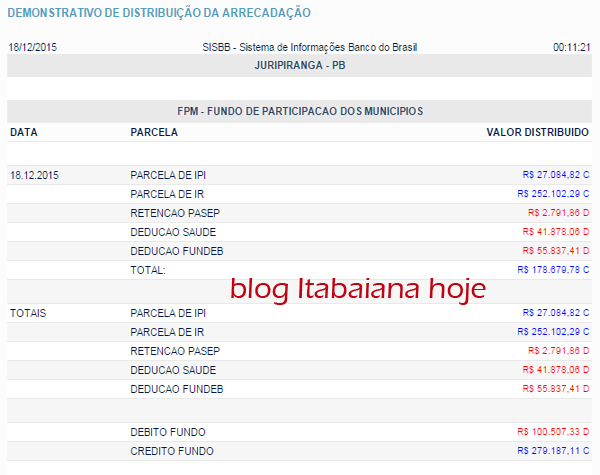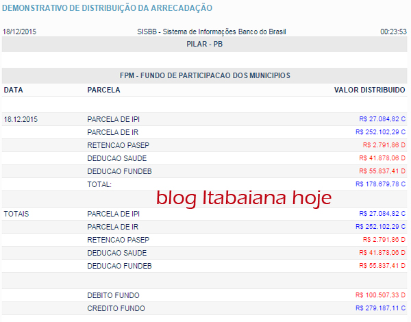 ITABAIANA: prefeitura R$ 312.689,58 +++ saúde R$ 73.286,61 +++ fundeb R$ 97.715,48 (de 1 a 18 de dezembro foram creditados R$ 2.381.856,14 (descontados R$ 690.653,97) liquido R$ 1 milhão 691 mil reais…