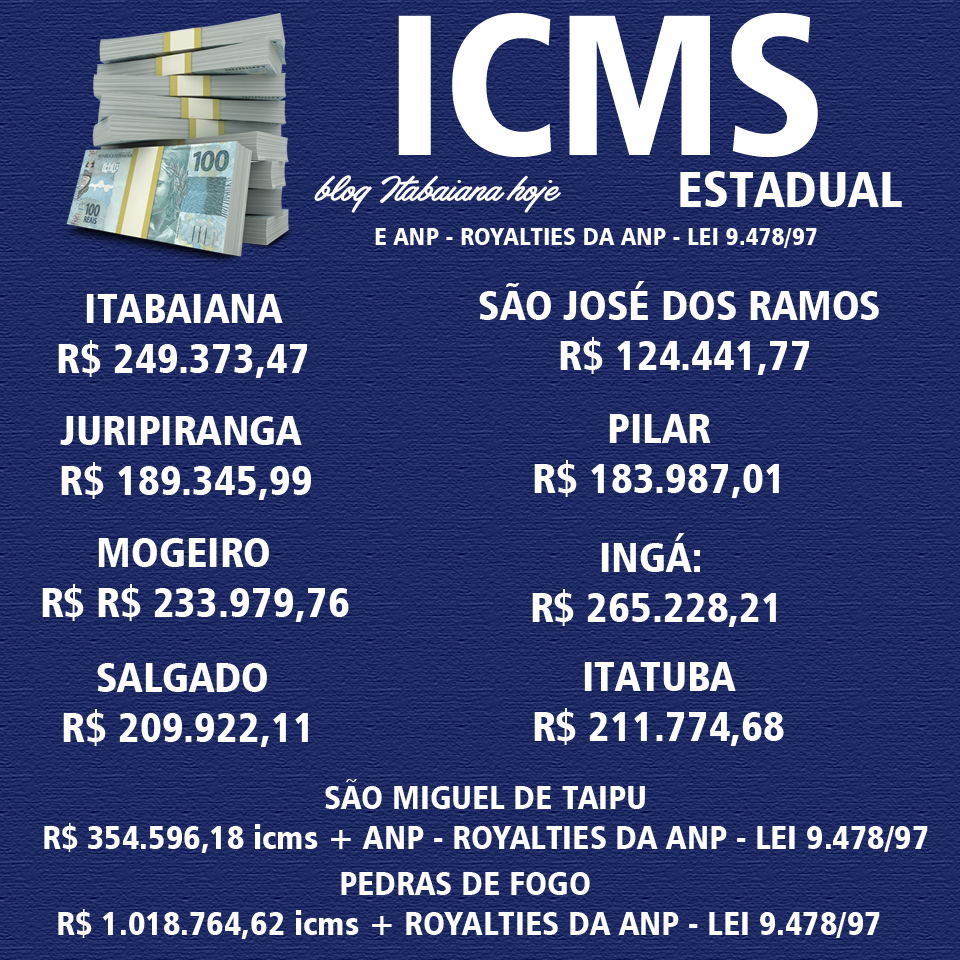 Nesta terça-feira, 25, foram creditados nas contas dos municípios o ICMS estadual, (além do icms, os municípios de São Miguel de Taipu e Pedras de Fogo, receberam Royalties da ANP) … veja os valores creditados (acompanhamento do blog Itabaiana hoje, junto ao Sistema de informação do Banco do Brasil) … Itabaiana r$ 249.373,47 — São Miguel de Taipu: r$ 354.596,18 ICMS e royalties da ANP – lei 9.478/97 — Mogeiro r$ 233.979,76 — Juripiranga r$ 189.345,99 — São José dos Ramos: r$ 124.441,77 — Salgado r$ 209.922,11 — Pilar r$ 183.987,01 — Ingá: r$ 265.228,21 — Itatuba r$ 211.774,68 — Pedras de Fogo r$ 1. 018.764,62 ICMS e royalties da ANP – lei 9.478/97