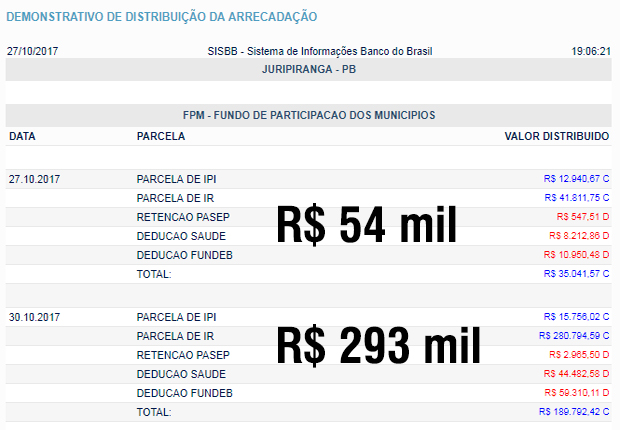 JURIPIRANGA: fpm extra 54 mil + FPM 293 mil (total: 347 mil reais)