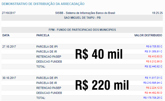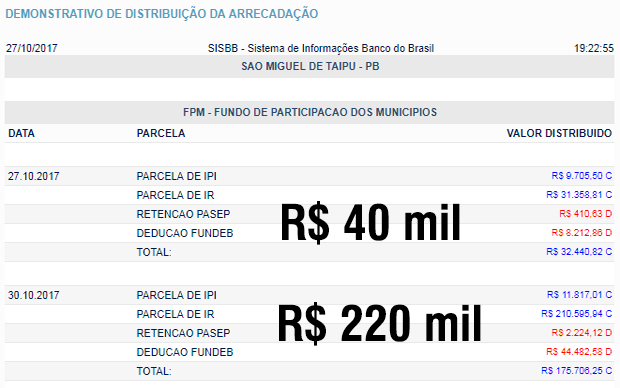 SÃO MIGUEL DE TAIPU: fpm extra 40 mil + FPM 220 mil (total: 260 mil reais)