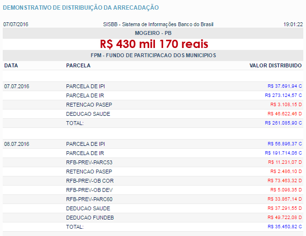 ATENÇÃO: veja na tabela abaixo, os valores correspondem ao FUNDEB, SAÚDE (TOTAL, é o valor creditado para a prefeitura) exemplo: Itabaiana, TOTAL/prefeitura 580 mil + Fundeb 87 mil + Saúde 146 mil = 814 mil