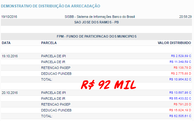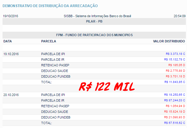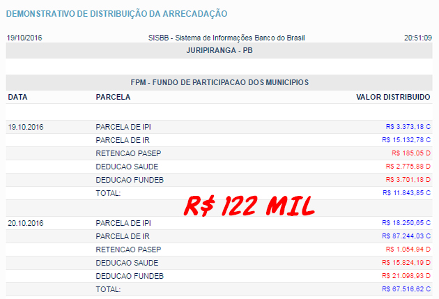 ( do dia 1 a 20 de outubro já foram creditados R$ 1. milhão… 163 mil … 247 reais, 64 em Itabaiana) … ( do dia 1 a 20 de outubro já foram creditados R$ R$ 720.785,46 em JURIPIRANGA em fpm, icms, e outros recursos)