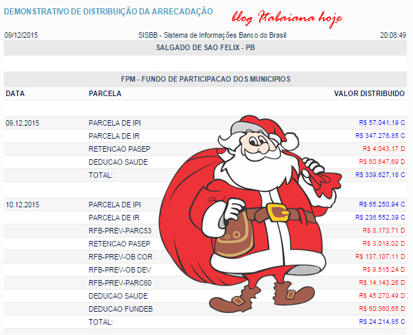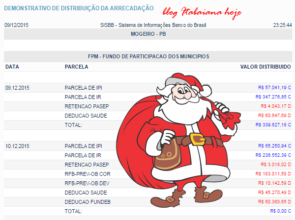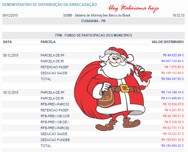 FPM: 1.º decêndio de dezembro entra na quinta-feira, 10 de dezembro, nas contas das prefeituras … Papai Noel chega mais cedo para as prefeituras… Veja os valores detalhados: FPM 1% dia 9, e FPM primeira parcela do dia 10 de dezembro de 2015… tudo junto e misturados…