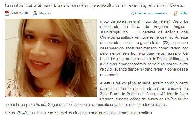 Gerente e outra vítima estão desaparecidos após assalto com sequestro, em Juarez Távora… Carro da refém foi encontrado na área do Engenho Angico, em Juripiranga- pb…
