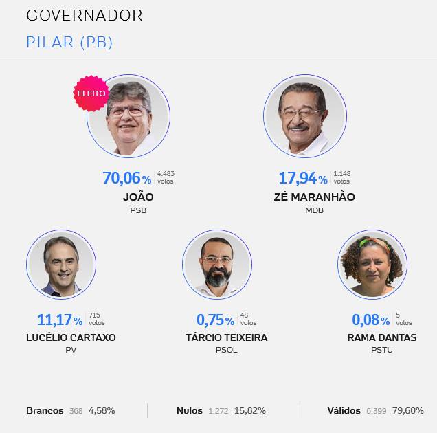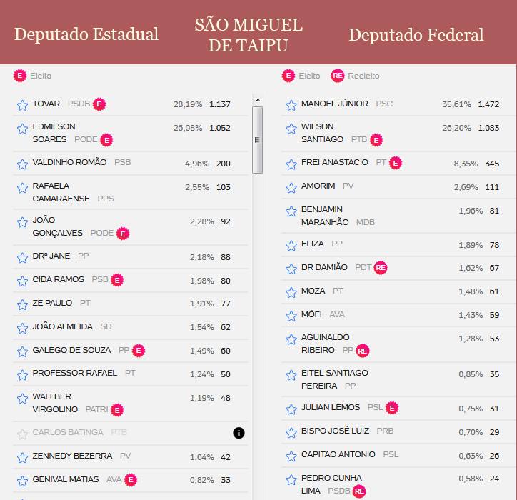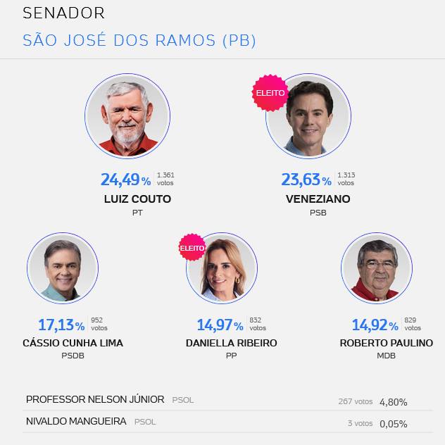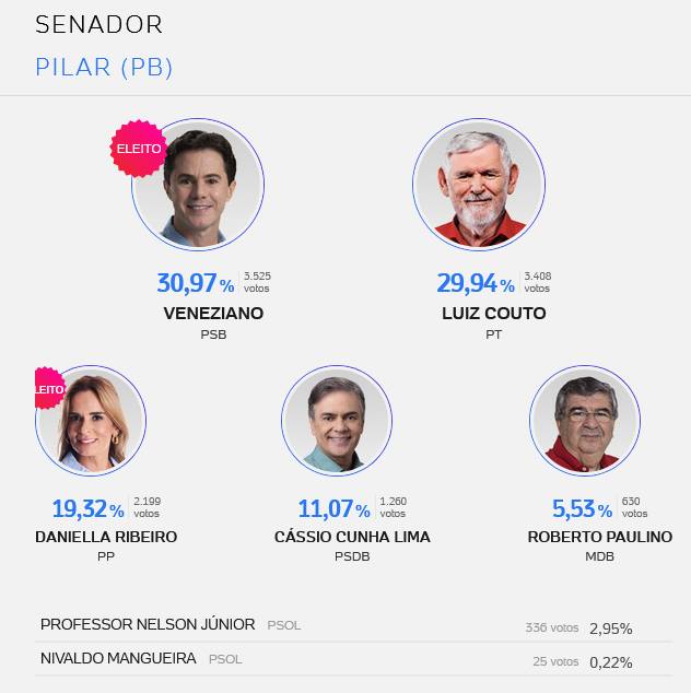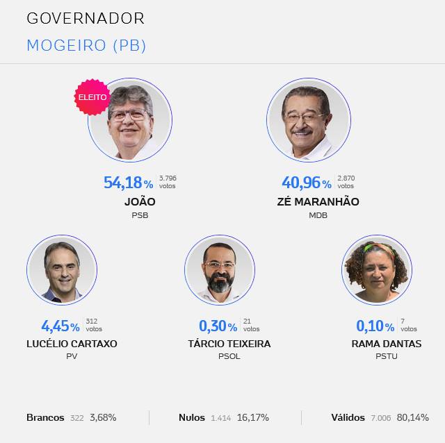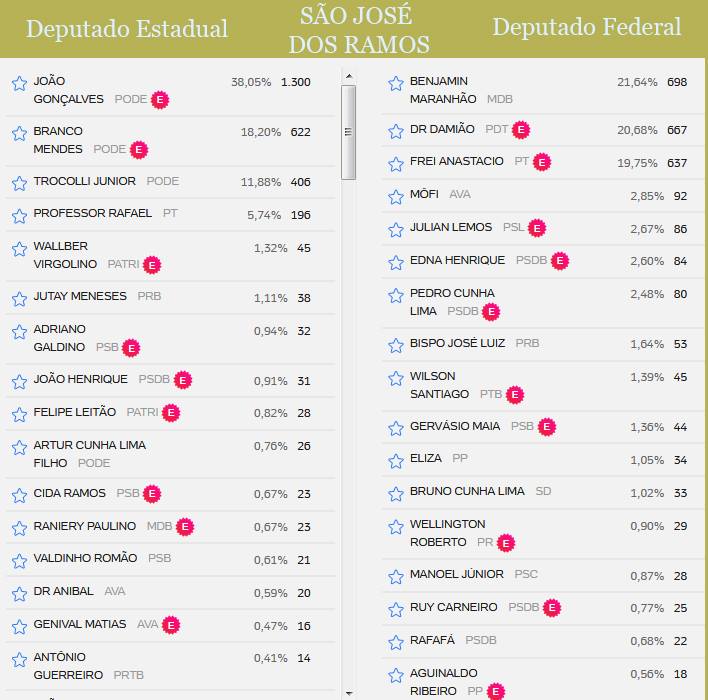 Resultado das eleições para deputado estadual, federal, senado e governo da Paraíba, nas cidades de Mogeiro, Salgado, Pilar, Juripiranga, São José dos Ramos, São Miguel de Taipu, Ingá, Pedras de Fogo e Itabaiana. Veja lista de votos dos deputados mais votados nessas cidade.