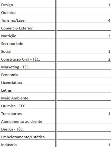 Na área administrativa, há 36 vagas, seguida da área de Educação, com 21 vagas. Há outras 32 oportunidades para alunos na área do Direito, 9 em Contabilidade, 7 em Marketing, 8 em Informática.