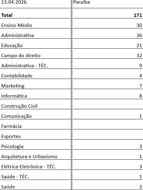 Há também vagas em Psicologia, Arquitetura e Urbanismo, Saúde e outras áreas, como verificou o ClickPB.